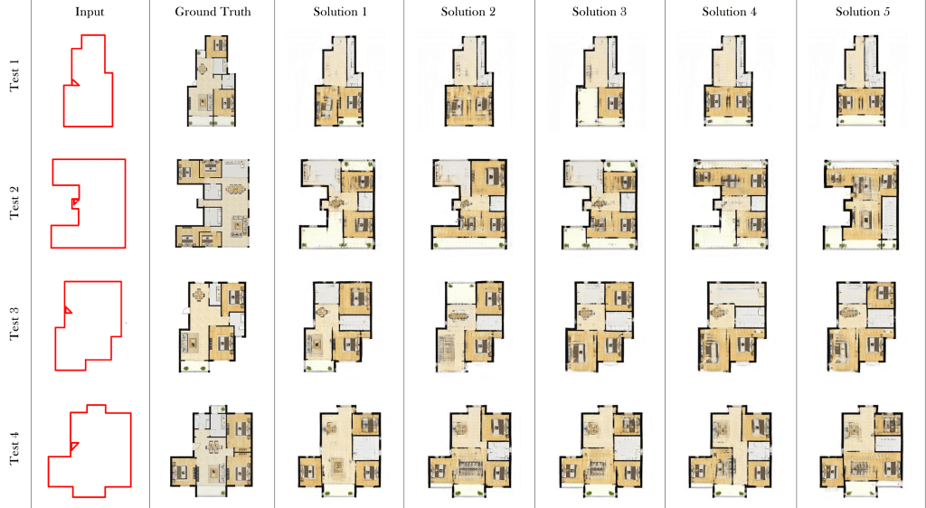 For the spatial layout problem, what we have given above is a solution based on big data and machine learning. By replacing different data, such as the floor plan of a commercial building, we can train artificial intelligence to learn and generate different types of building plans.
