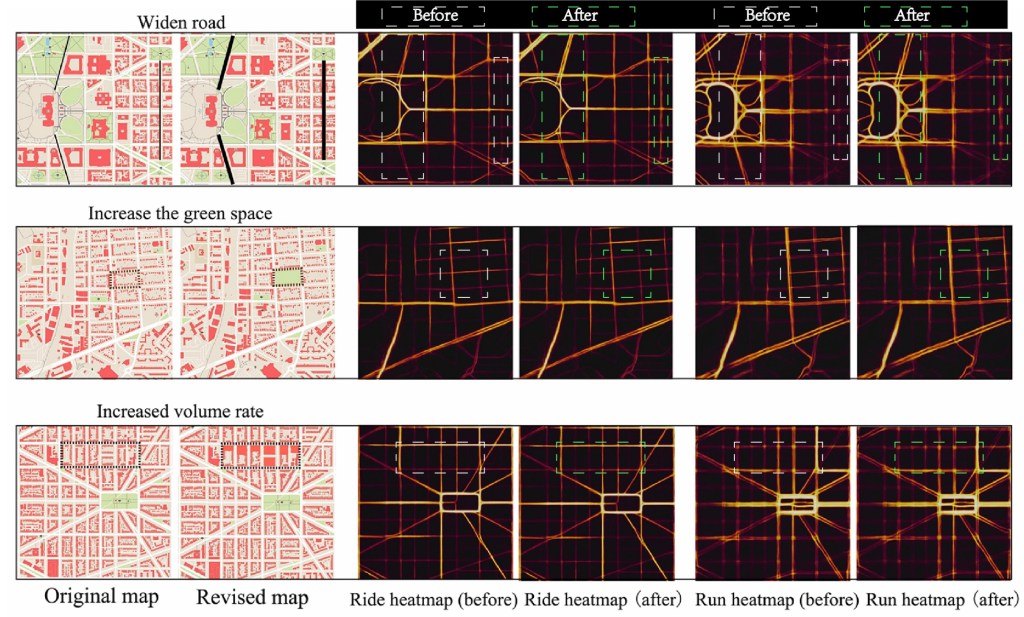 The artificial intelligence model with completed training process has predictive capabilities, and what it can predict is the type of data we filter for it during training. For example, in our latest study, we used the positioning function of the mobile app to collect a large number of users’ walking and cycling data. We presented the data on a flat map through the heat map model, and trained AI to predict the number of times users pass by each area based on the city map. The larger the predicted value is, the more people will pass by walking or cycling, which brings more vitality to the community.