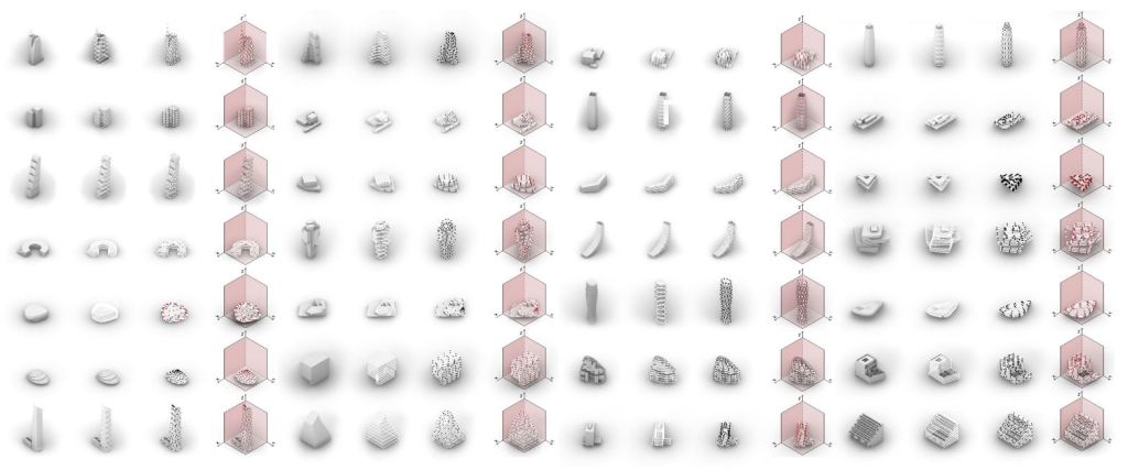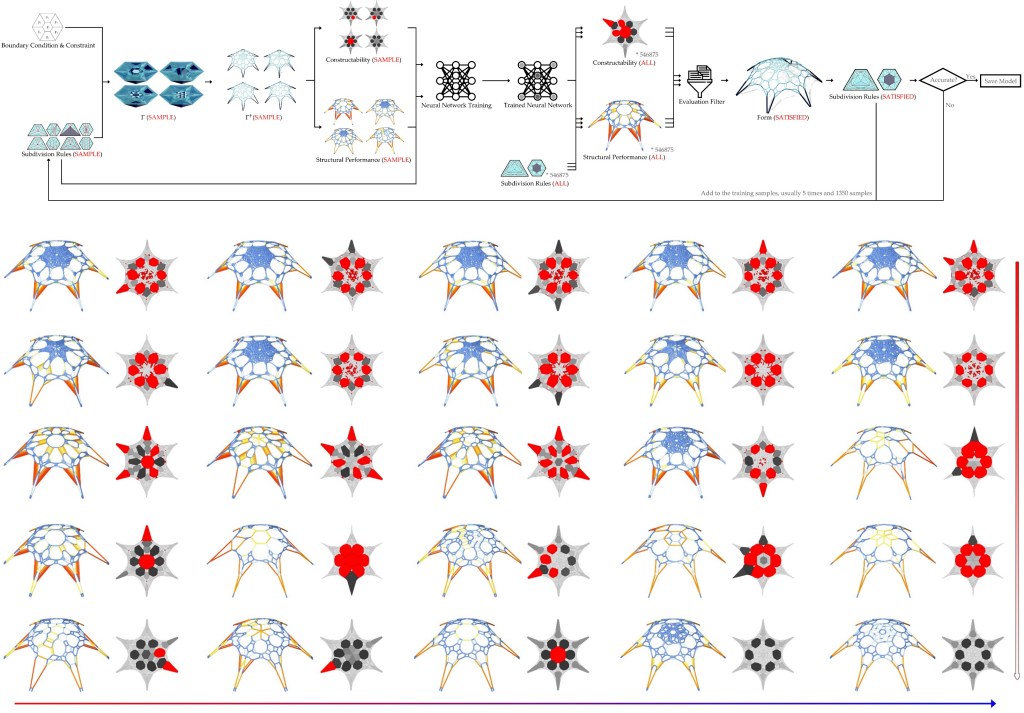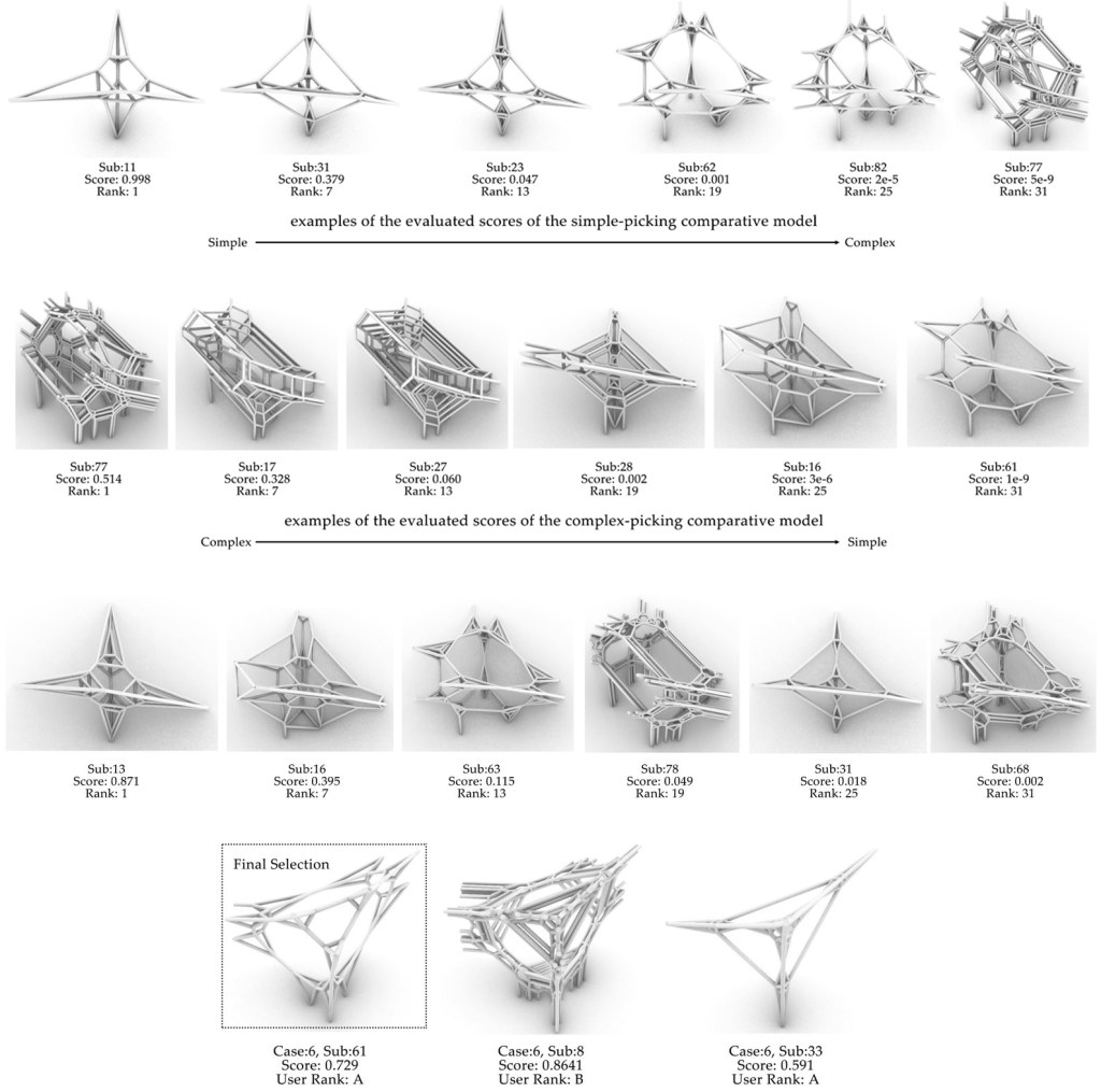 Another interesting experiment is a tentative development in our laboratory. The goal is to expect that the artificial intelligence model can interact with humans and learn human aesthetic tendencies through human feedback data, thereby helping designers conduct more effective design evaluations. First, let an experimenter observe several sets of patterns and choose one of his favorites. Then we repeat this experiment, by continuously collecting the forms selected by the experimenter, and building a database to train the artificial intelligence model to learn the logic when the experimenter chooses the form. The trained artificial intelligence model can automatically determine whether the shape will be liked by the experimenter according to the subsequently generated shape, and then iteratively find the experimenter’s favorite shape as a recommendation system. In the future, if we replace the morphological data with more general architectural renderings or floor plan data, this system will be able to learn the aesthetic inclination of the design evaluator (such as the clients), and then invest in its preferred generation plan.
