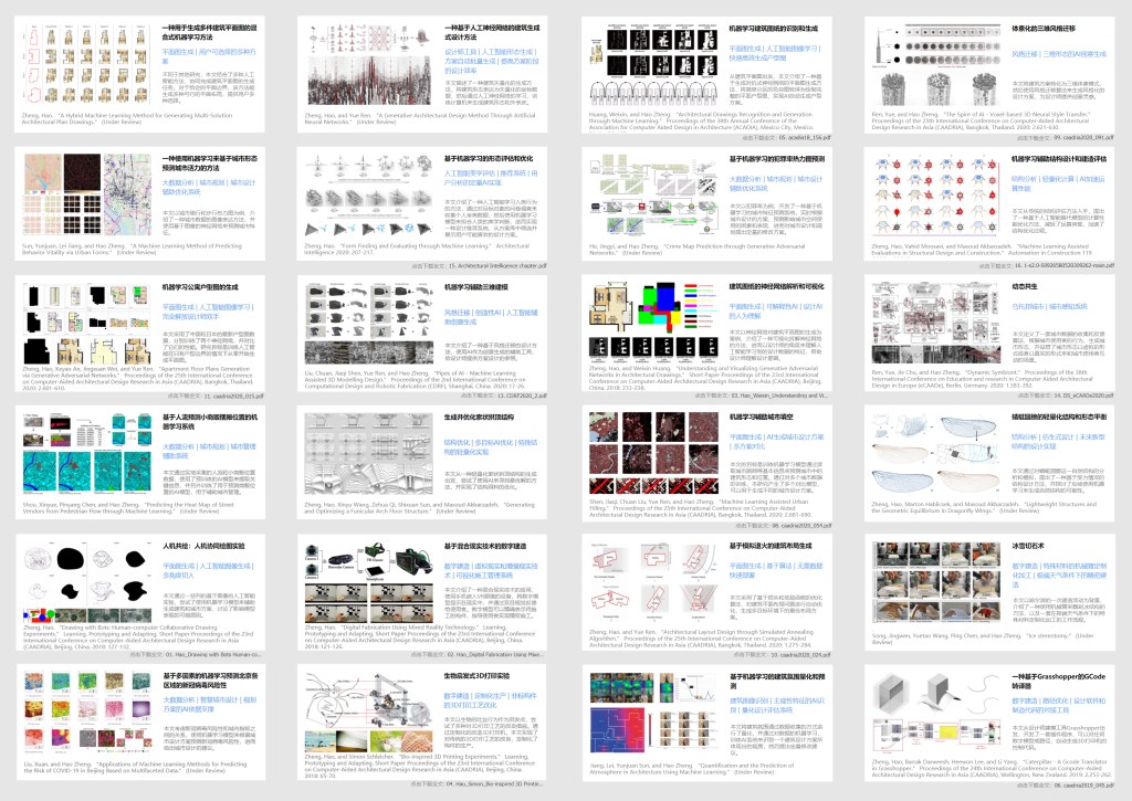 Our academic achievements in different fields mainly involve artificial intelligence and digital design, architectural plan generation, form finding, plan optimization; urban data analysis, urban prediction models, planning optimization; creative plan generation, landscape big data, scene recognition; construction path optimization, computer vision, and virtual reality. Past research papers were published in SCI journals and top international conferences, and included in CAADRIA, ACADIA, eCAADe, and many other international academic associations.